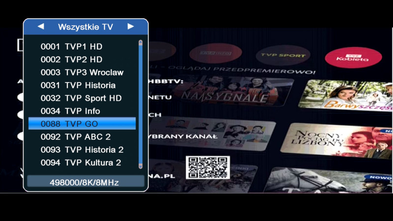 Lista programów MUX-3. W tle plansza TVP GO
